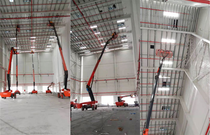 徐州鑫友排煙天窗安裝團隊入駐浙江5210物資公司寧波工廠,正式進入PM包裝廠房,備品備件立體庫的圓拱形天窗施工安裝中。上圖為安裝人員利用升降車作業中。