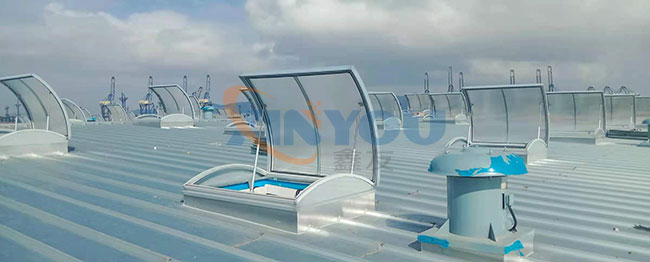 圓拱形的設(shè)計(jì),外觀美觀大氣,能更好的防水,同時(shí)有效減少風(fēng)壓阻力,天窗頂部為采光板,有效增加室內(nèi)亮度,開啟電機(jī)設(shè)計(jì)成24V電壓,可連接消防聯(lián)動(dòng)控制系統(tǒng)及風(fēng)、雨、煙感應(yīng)器。***開啟角度為45°。